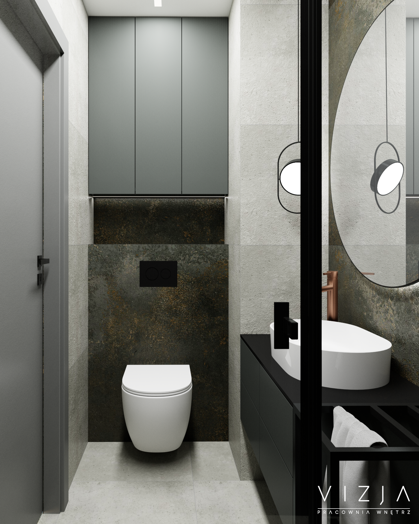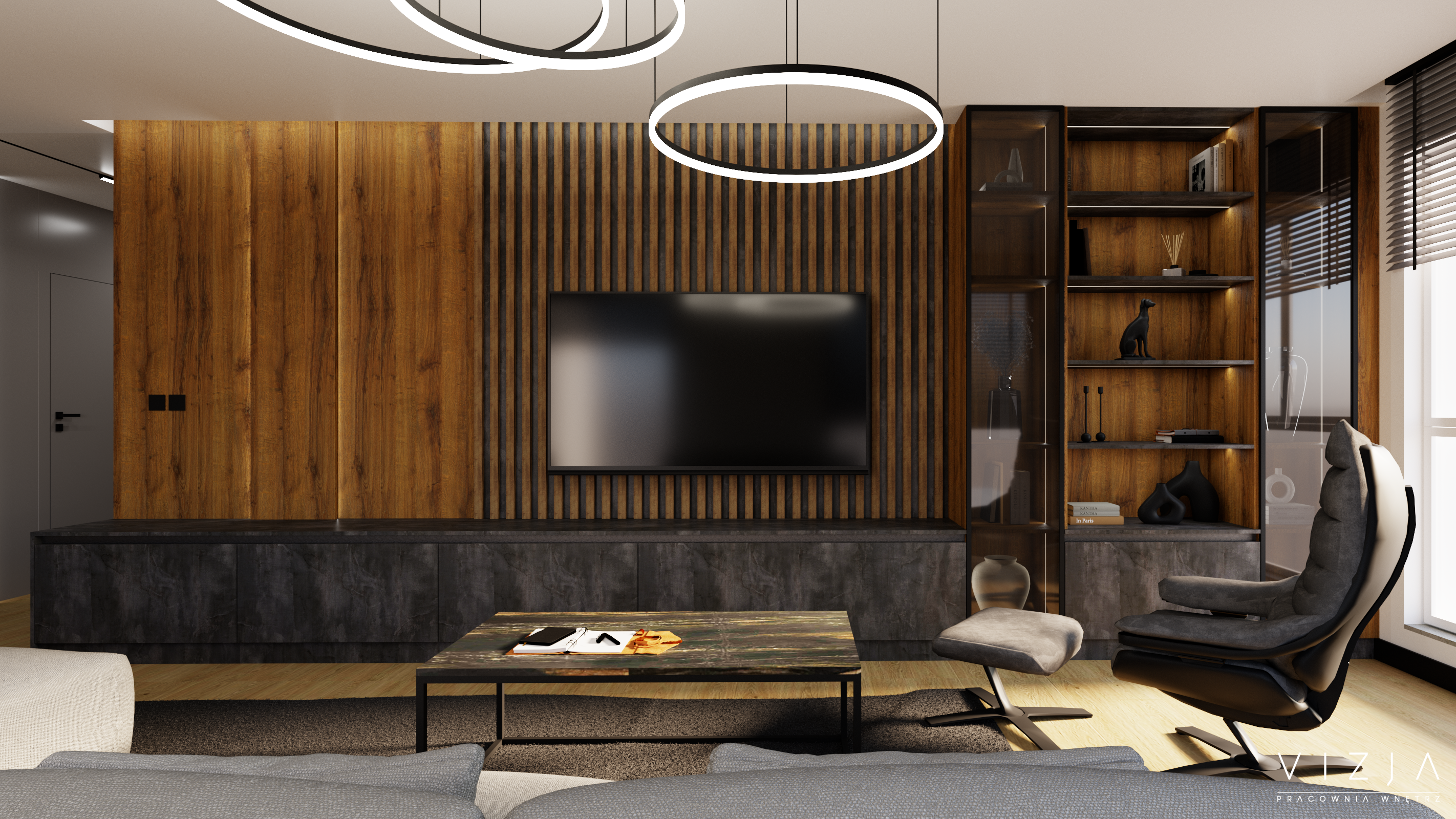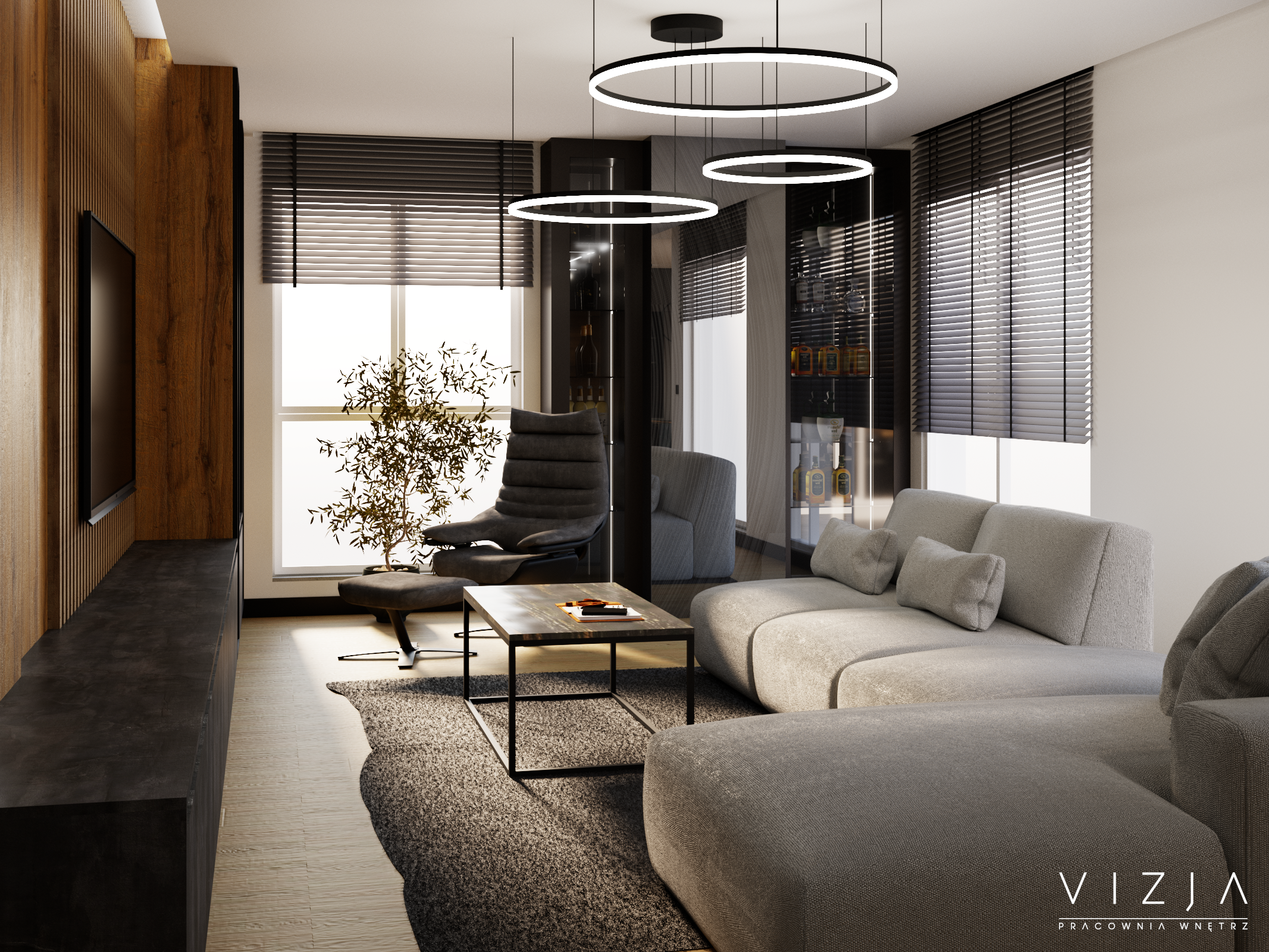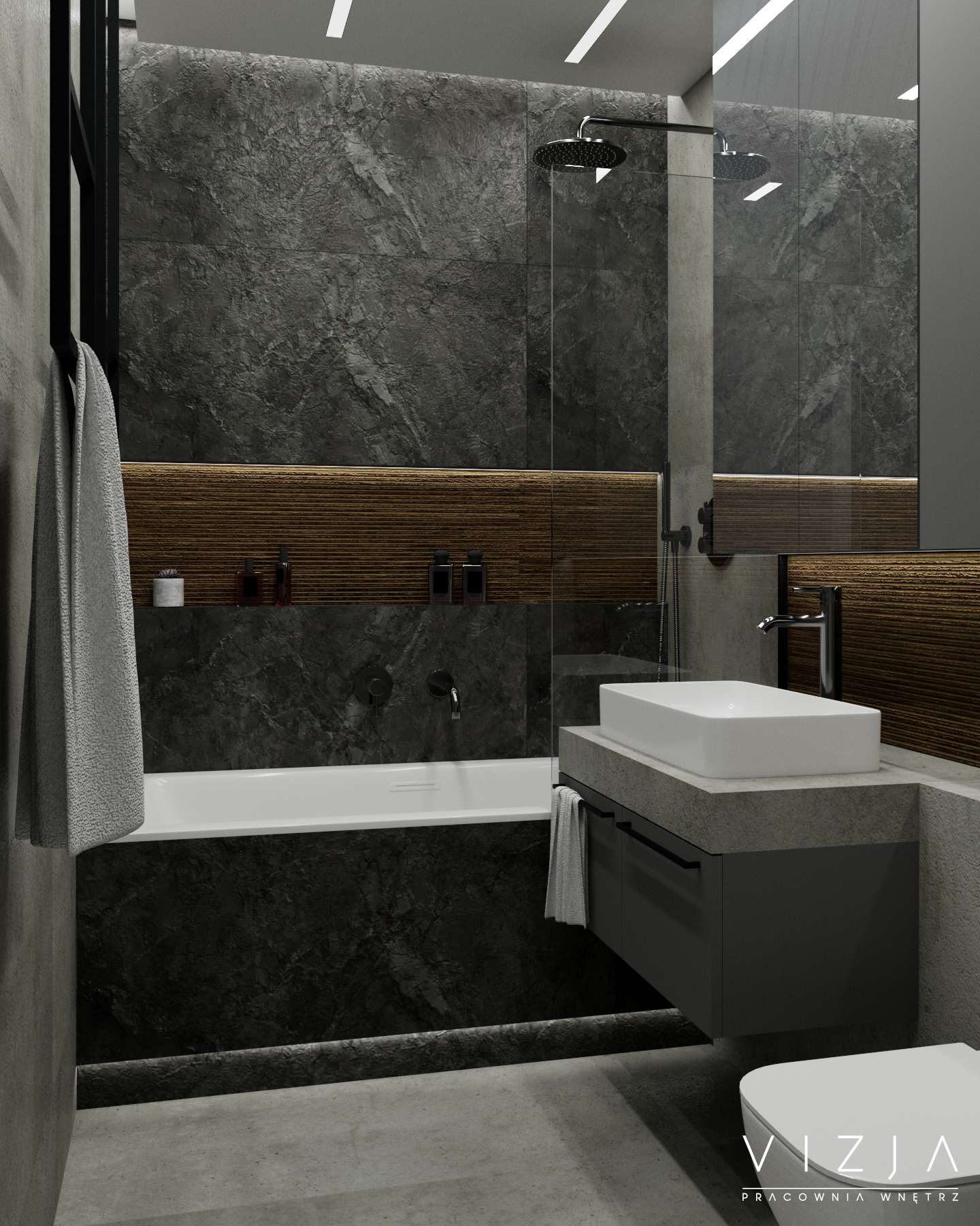 Projekt części apartamentu obejmujący strefę dzienną oraz łazienki. Tym razem inwestorowi zamarzyło się wnętrze nawiązujące do stylu loftowego, jednak miało być ono równocześnie eleganckie i nieoczywiste. Bazą dla projektu stała się kolorystyka, w której przeważa czerń oraz szarości. Pomimo zastosowania spójnej gamy kolorystycznej, wnętrze nabiera charakteru dzięki zróżnicowaniu faktur. W projekcie są elementy betonowe, wyraźna struktura surowego kamienia, przetarcia imitujące beton oraz metale.