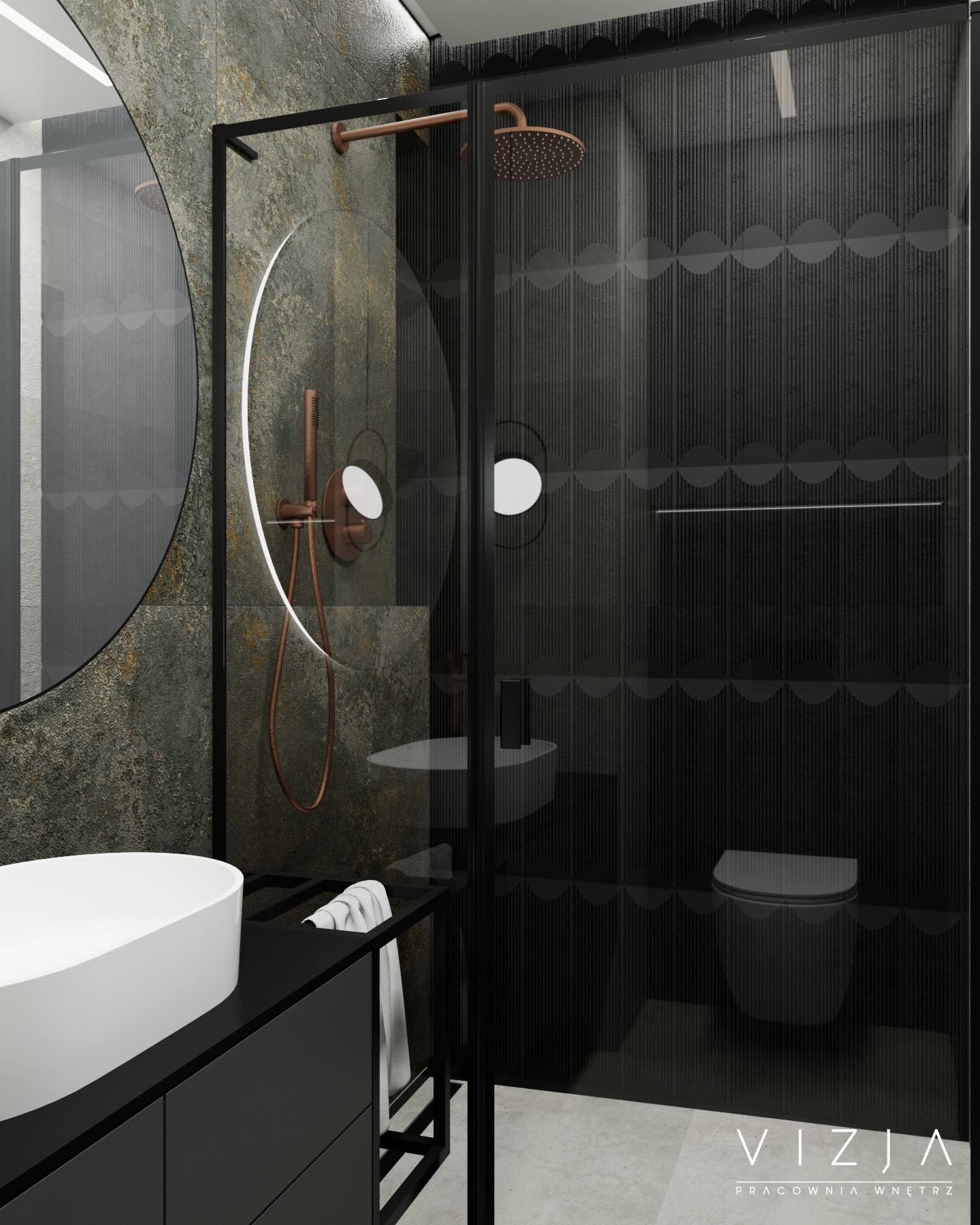 Projekt obejmował też łazienki. Jednolitość przestrzeni podkreśla zastosowanie tej samej płytki bazowej. Jednak każda z nich ma odmienną aranżację. Pierwsza to zestawienie mocno fakturowanej płytki, przypominającej surowy kamień, z dekorem drewna. W drugiej pojawiła się metalizowana płytka oraz współgrające z nią baterie w kolorze miedzi, zestawione z mocno wypukłą mozaiką. Całe wnętrze to spójna, lecz nie nudna aranżacja, bo każde z pomieszczeń przyciąga uwagę innym, zaskakującym detalem.