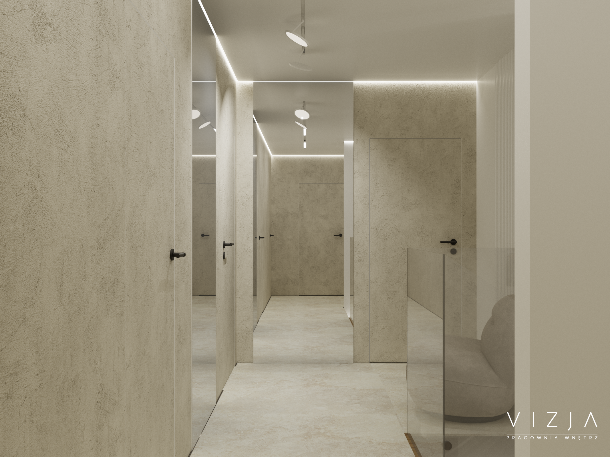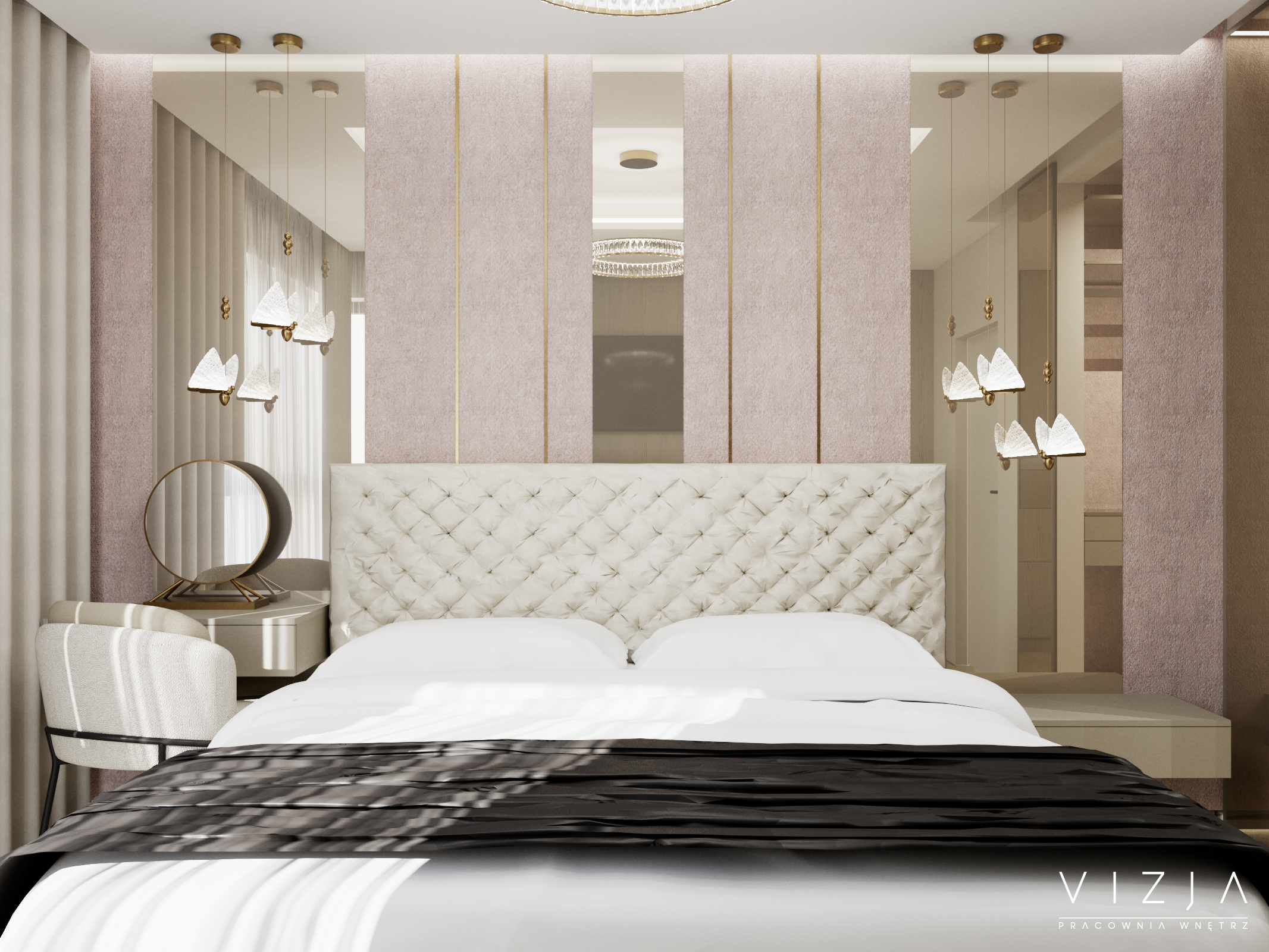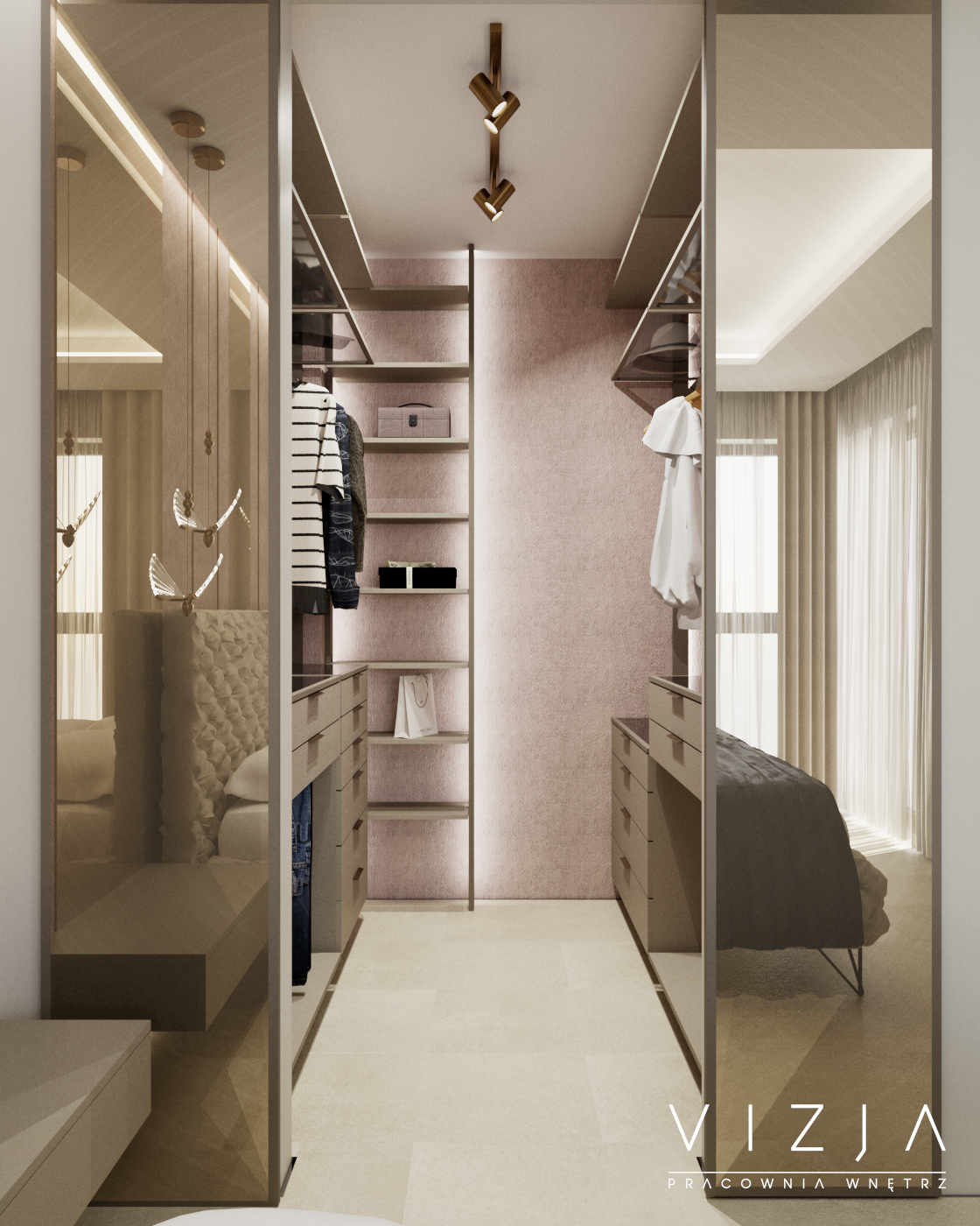 Sypialnia z garderobą to najbardziej dekoracyjny i kobiecy pokój. Uwagę zwraca wiszące, okazałe oświetlenie, teksturowana, różowa tapeta oraz otwarta forma garderoby, w której można wyeksponować ubrania. Minimalistyczną formę przyjął korytarz z półotwartą klatką schodową. Zastosowałyśmy tu tynk dekoracyjny w stylu japandi i ukryte drzwi. Ozdobę dla tego wnętrza stanowią lustra oraz ukryte oświetlenie, podkreślające teksturę ścian.