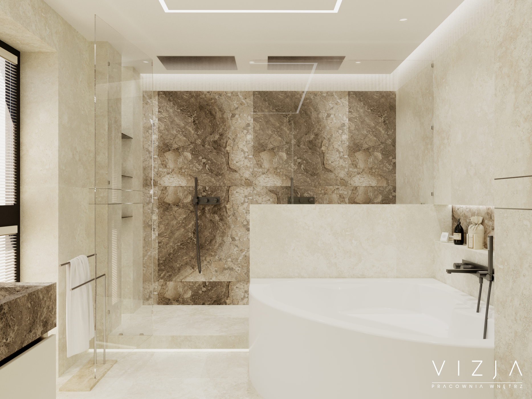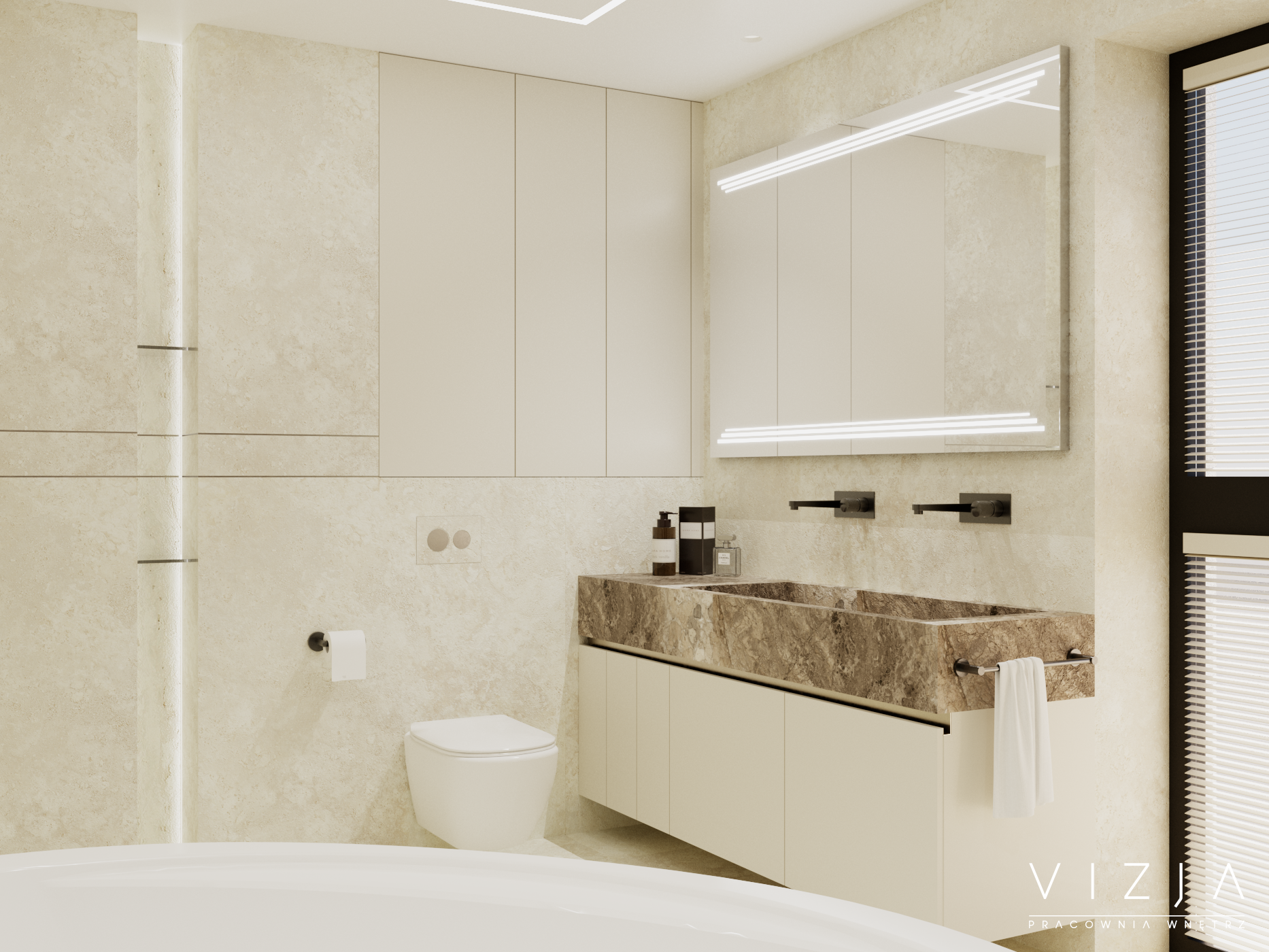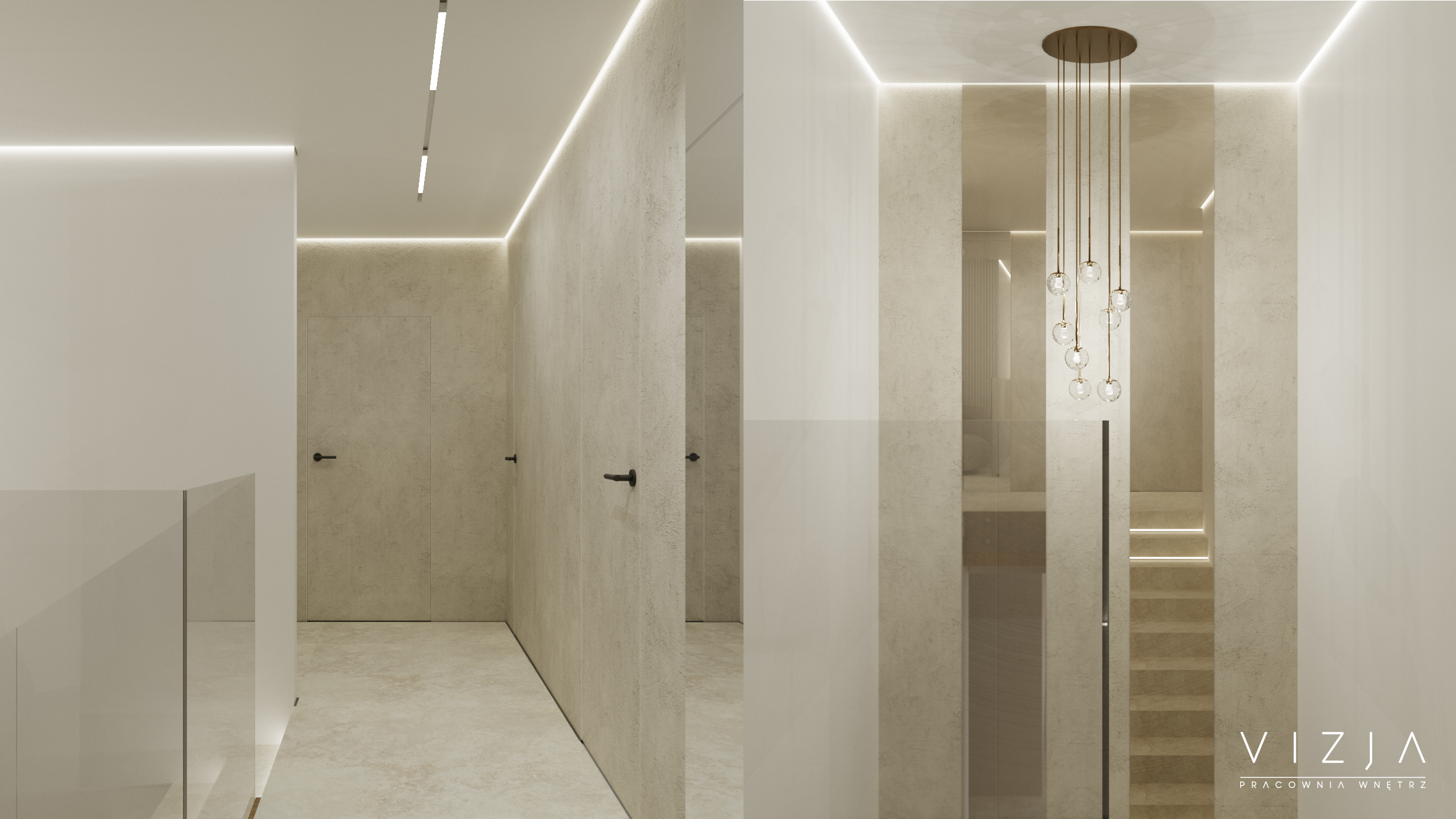 Na piętrze domu zlokalizowałyśmy strefę prywatną. Powtarzającym się elementem jest trawertynowa podłoga, wykorzystanie różnych odcieni beżu oraz geometryczne podziały, dzięki czemu dom ma spójny charakter. Ze względu na prywatny charakter, pomieszczenia zostały urozmaicone różnymi akcentami, tym samym nabrały indywidualnego charakteru, spełniając oczekiwania funkcjonalne i stylistyczne wynikające z ich funkcji.