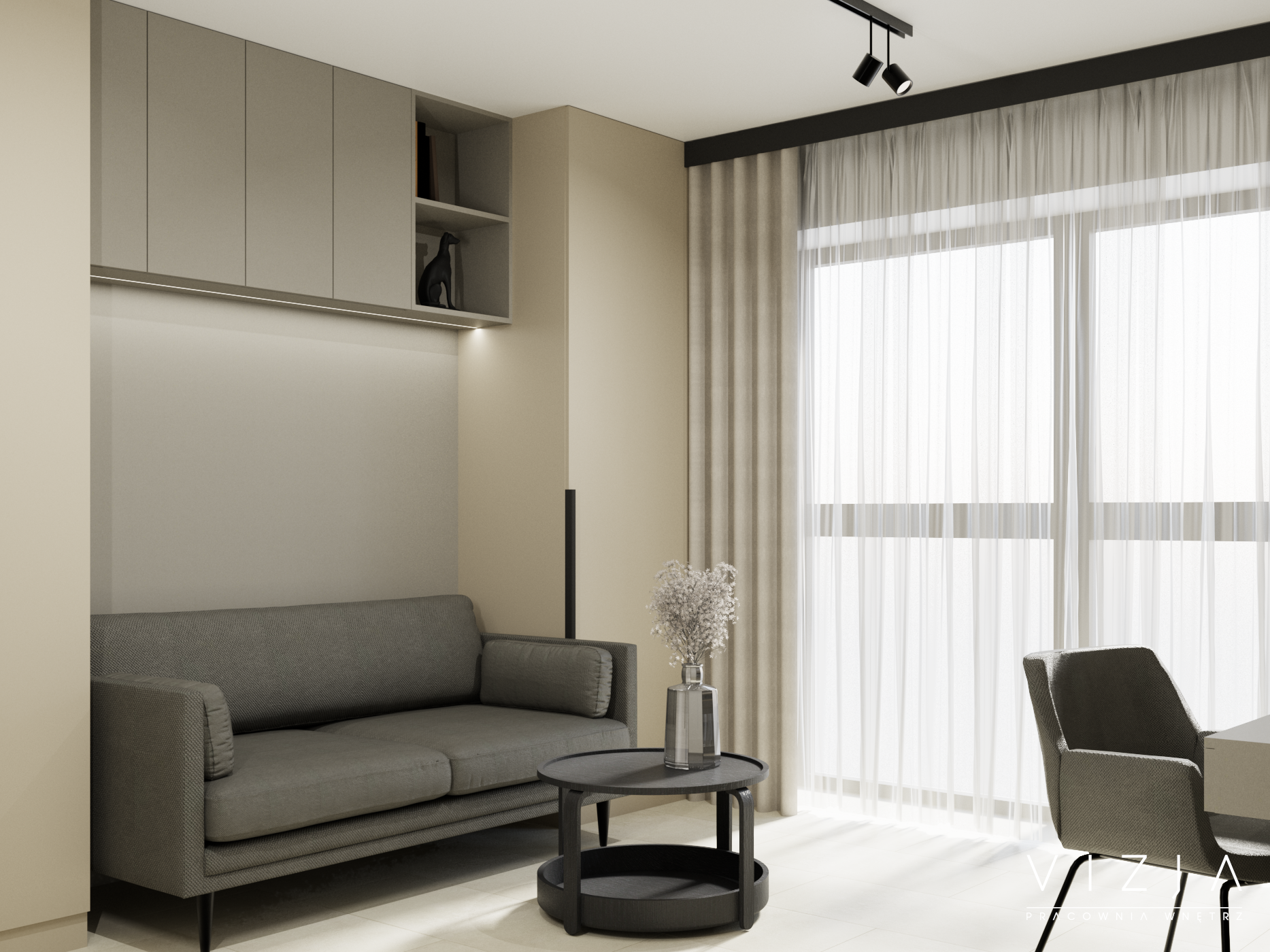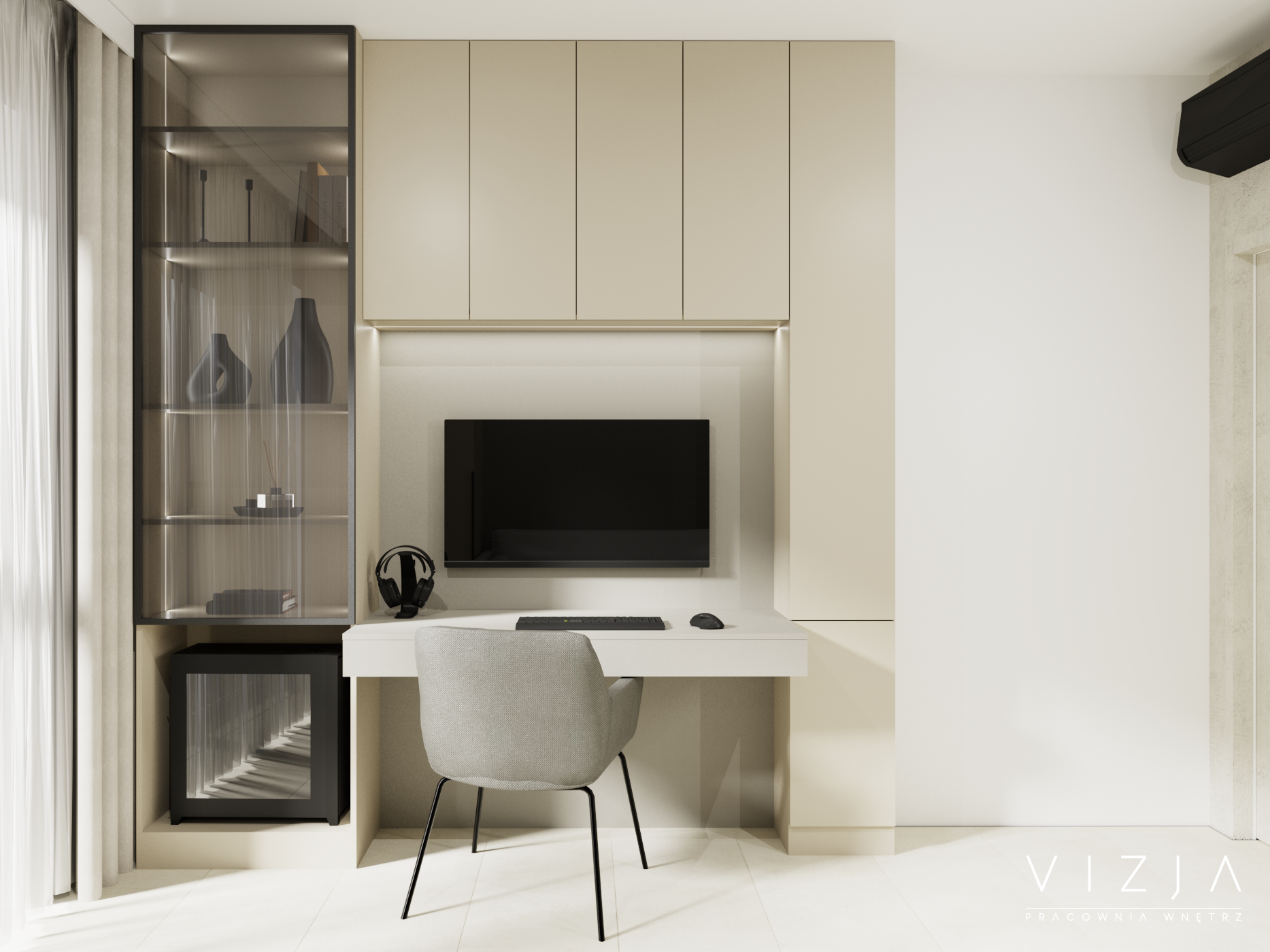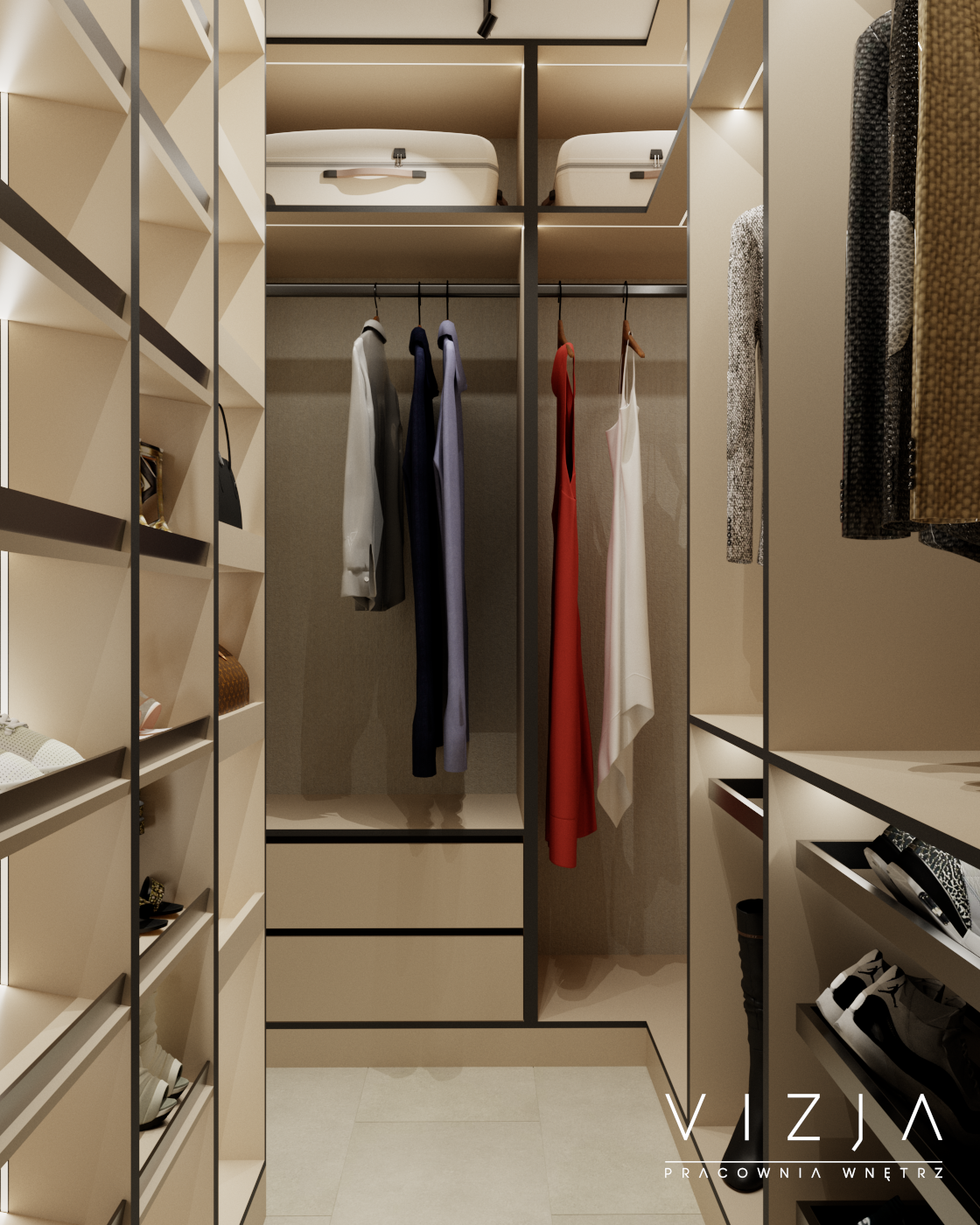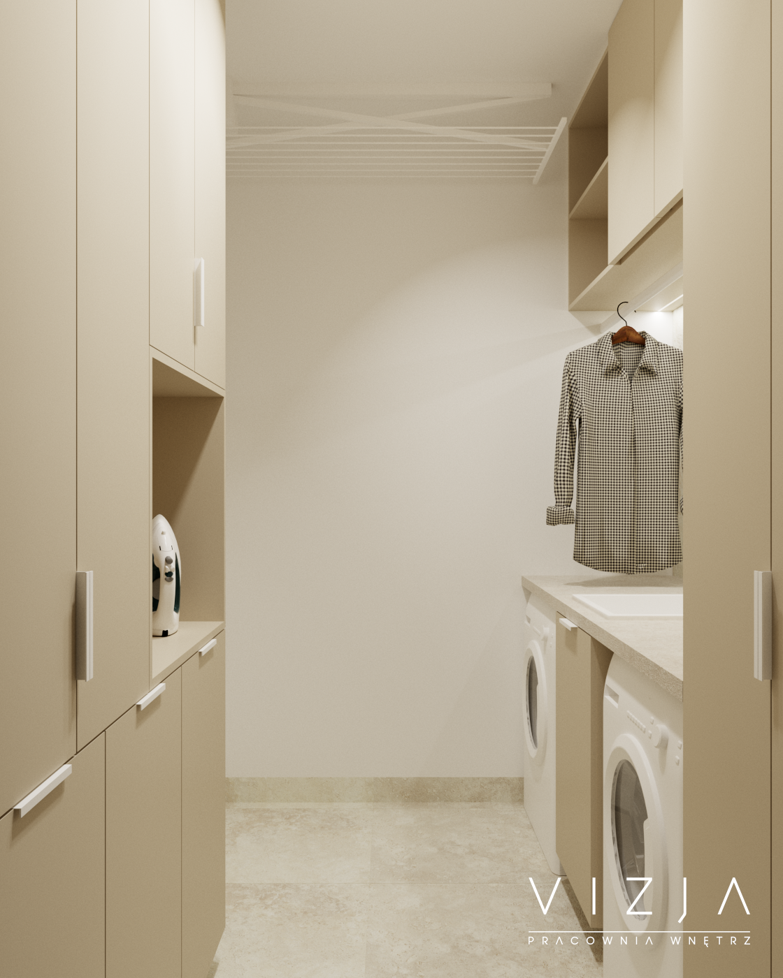 Na piętrze domu zlokalizowałyśmy strefę prywatną. Powtarzającym się elementem jest trawertynowa podłoga, wykorzystanie różnych odcieni beżu oraz geometryczne podziały, dzięki czemu dom ma spójny charakter. Ze względu na prywatny charakter, pomieszczenia zostały urozmaicone różnymi akcentami, tym samym nabrały indywidualnego charakteru, spełniając oczekiwania funkcjonalne i stylistyczne wynikające z ich funkcji.
