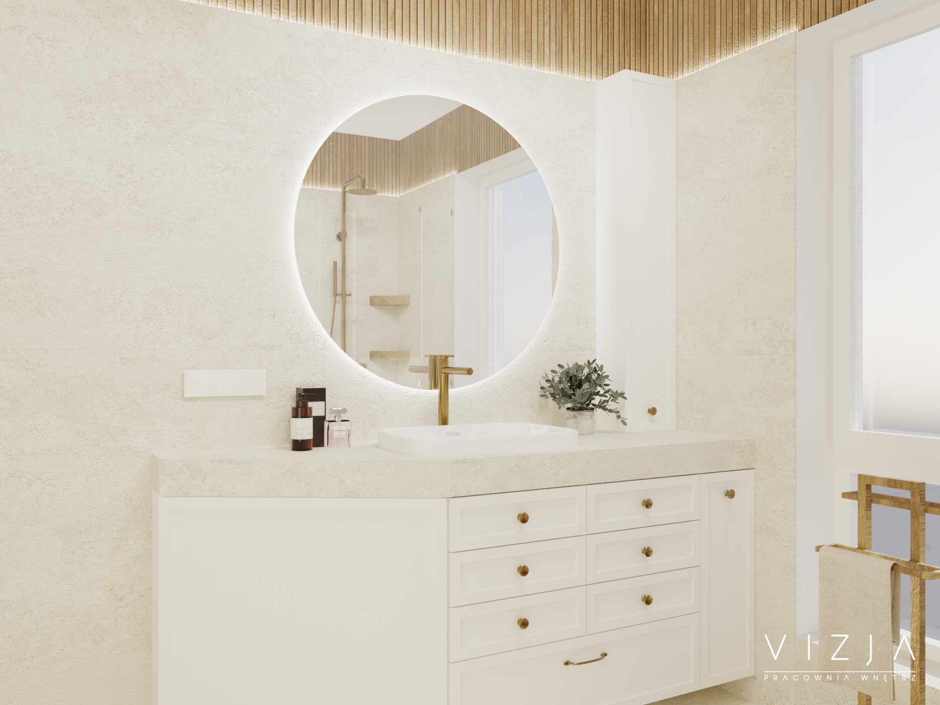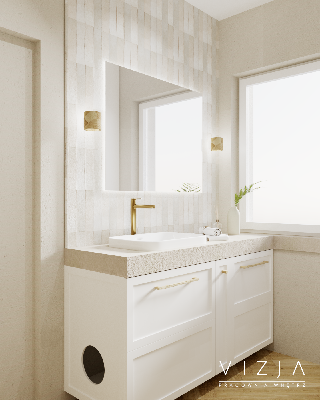 Łazienki są spójną kontynuacją stylu utrzymanego w reszcie domu. Na parterze łazienka pełni też rolę kotłowni, dlatego najważniejsze było schowanie wszystkich urządzeń za zabudową meblową. Ze względów praktycznych została ona wykończona tynkiem dekoracyjnym, a ozdobę stanowią akcenty z jasnej mozaiki. Na piętrze znajduje się salon kąpielowy. Jest tu prysznic oraz wanna. Jednolite płytki imitujące kamień zostały zestawione z trójwymiarowymi detalami drewnianymi – całość to swoista oaza odpoczynku.