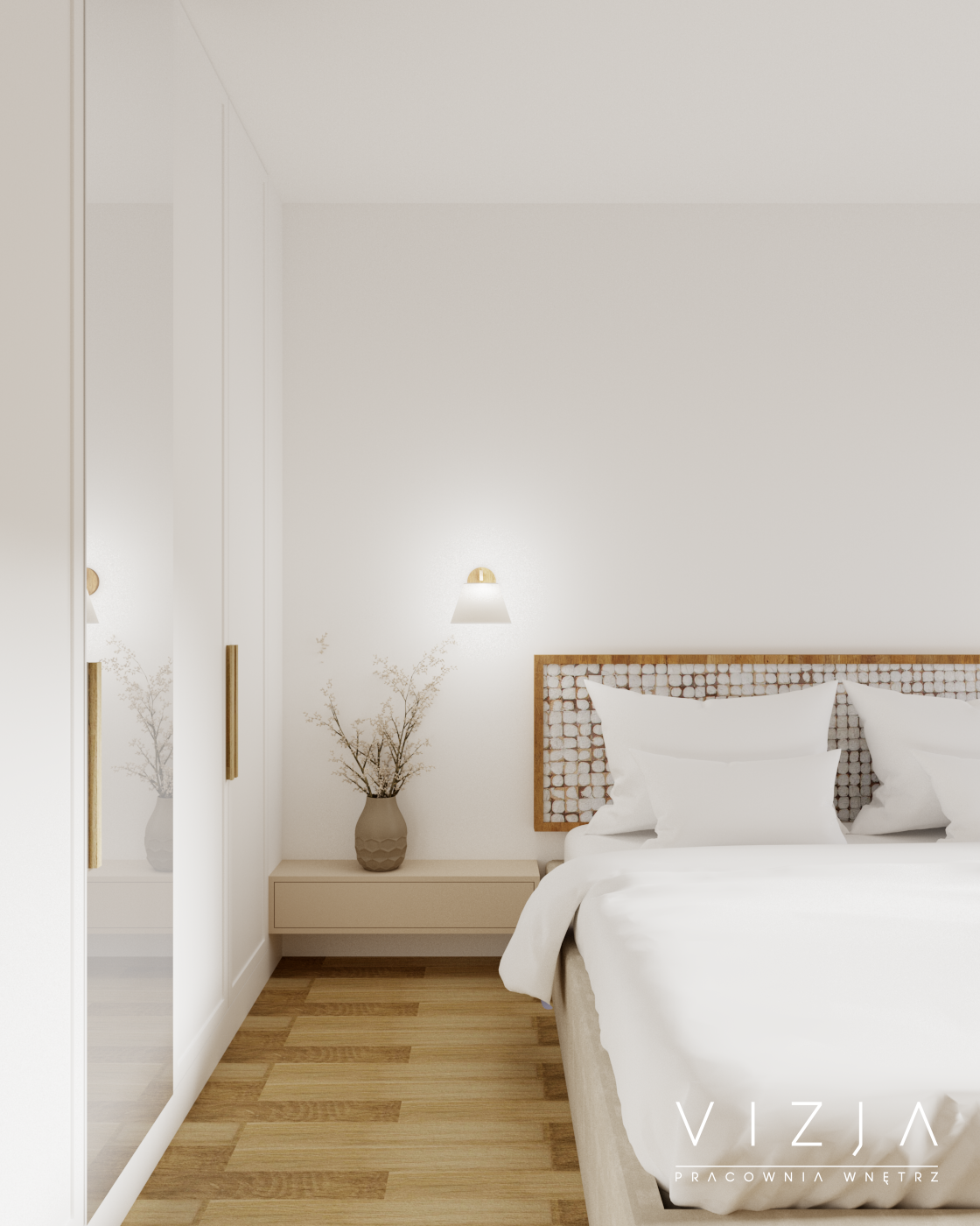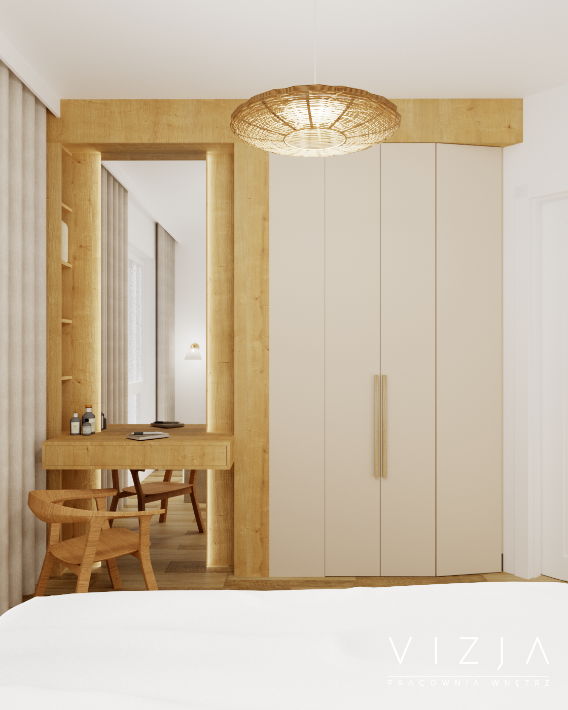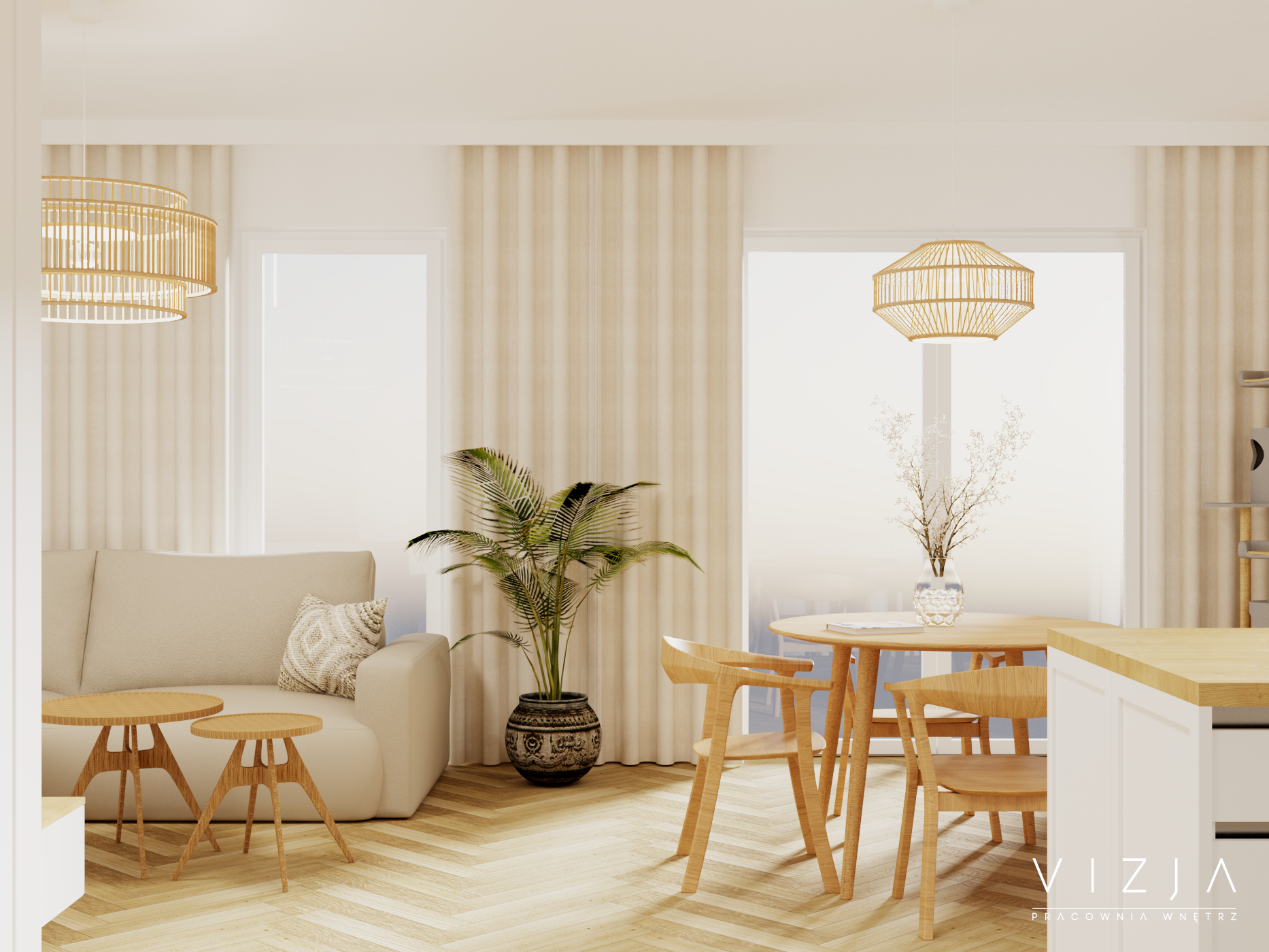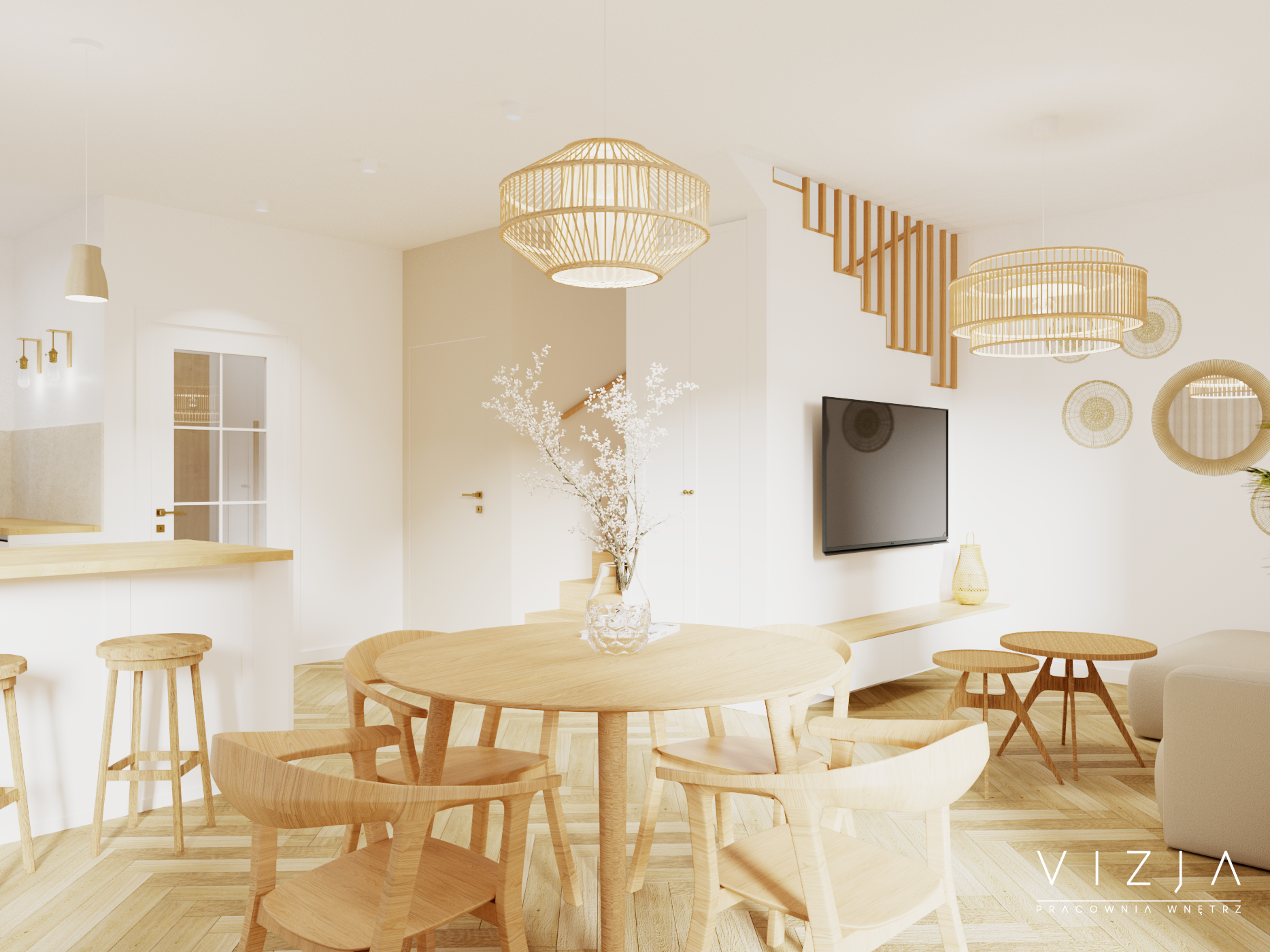 Projekt mieszkania w zabudowie bliźniaczej, gdzie na parterze zlokalizowano strefę dzienną. Dzięki przewadze bieli i beżu oraz dużym oknom wnętrze jest przestronne i pełne światła. Podłoga wykonana z płytek imitujących drewno, naturalne drewniane schody oraz meble z litego drewna wprowadzają do wnętrza naturę, tworząc przytulne środowisko idealne do odpoczynku i regeneracji.
