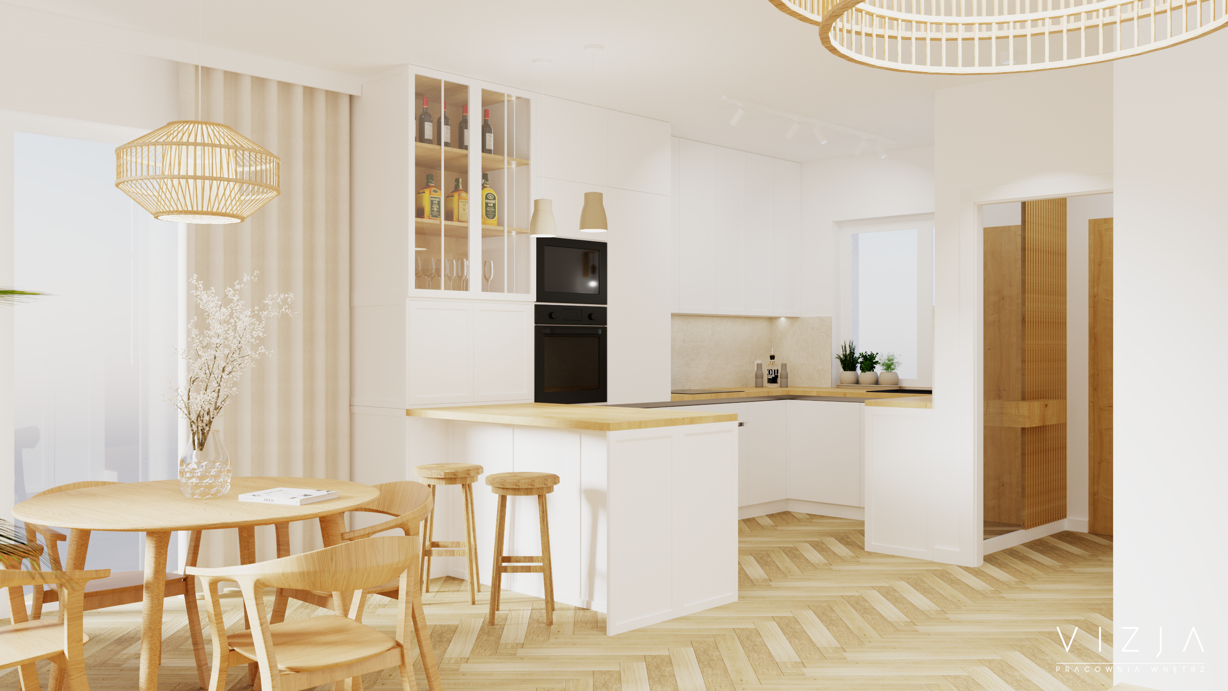 Kuchnia została zaprojektowana w kształcie litery C. Taki układ pozwala na maksymalne zagospodarowanie przestrzeni, gdzie strefa użytkowa jest schowana w głębi pomieszczenia, a zabudowa kończy się szeroką wyspą, umożliwiającą wspólne spędzanie czasu. Obok umiejscowiona została strefa jadalni z drewnianym, okrągłym stołem, który w razie potrzeby można rozłożyć. Znalazło się także miejsce do relaksu, w którym uwagę przykuwa wypoczynek o miękkich, zaokrąglonych kształtach.